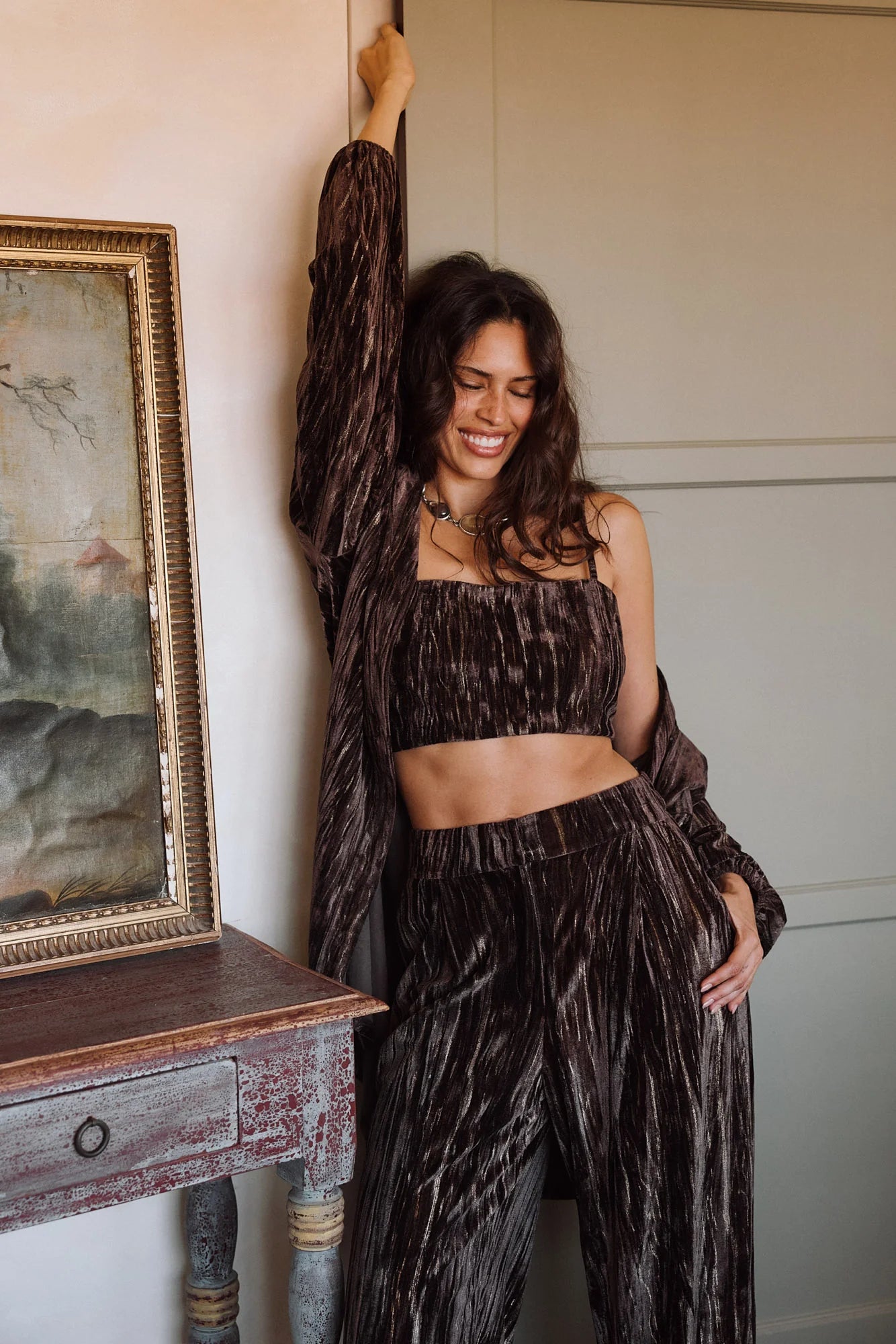 The newest addition to your Rhea collection, this espresso velvet crop top is soft, luxe, and sprinkled with gold foil. A smocked back and adjustable straps make it easy to wear, and paired with the matching trousers, it’s the piece everyone reaches for first—and sells out fast.
